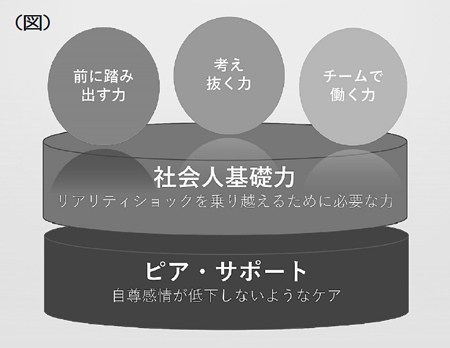 リアリティショックを乗り越えるためには「社会人基礎力」の発揮が必要になってくると高橋氏。「社会人基礎力」の土台にピア・サポートが必要です。高橋氏は「前に踏み出す力」「考え抜く力」「チームで働く力」の必要性をのべ、生かすためには自尊感情が低下しないようケアが大切であると考えます(図)。