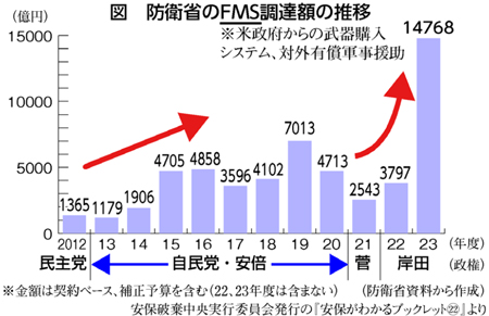 成長戦略に位置づけられ、防衛装備移転三原則に変わっても、完成品の輸出はわずか一件で、事業の継続を断念する企業があいついでいます。日米「共同開発」と言いますが、米軍需産業は武器を売りつけ、データを持って行く一方。日本の防衛政策自体が米国のコントロール下に置かれ、日本の軍需産業もそのなかに深く組み込まれています。そして、日本の防衛予算は、米国に武器を売りつけられて、「爆買い」と言われるほどに膨れあがっています(図)。