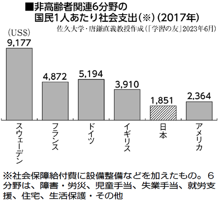 林さんは、「岸田政権の少子化対策は、社会保障費を1兆円削減して財源を確保するとしており、世論に分断をもちこんでいる。この削減額は“医療・介護崩壊”を招いた小泉構造改革と同規模で大変危険」と指摘します。一方、5年間で43兆円という大軍拡計画は、あらゆる手段を使ってすすんでいます。しかし、その予算の一部、2・3兆円があれば、230万人の介護職員すべての給与を、月8万円増やすことが可能です。「軍事費ではなく、低すぎる社会保障費、現役世代への社会支出(図)こそ増やすべき。ケアの価値、介護の専門性を市民と共有し“ミサイルではなくケア”を合い言葉に、政治の優先順位を変える必要がある」と訴えます。