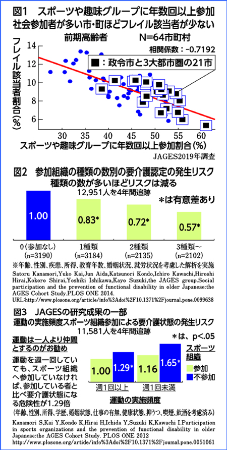 最初に、近藤さんは日本老年学的評価研究(JAGES)機構の調査結果を提示。市町村の協力を得て、趣味や老人クラブ、スポーツなどにどのぐらいの頻度で参加しているのか、高齢者(65~74歳)の回答を得て、自治体同士を比べました。すると、フレイル該当者の割合は最小5・2%、最大13・3%で、格差は2・6倍に。スポーツや趣味のグループに年数回以上参加している人の割合が大きい自治体ほど、フレイル該当者が少ないことがわかりました(図1)。