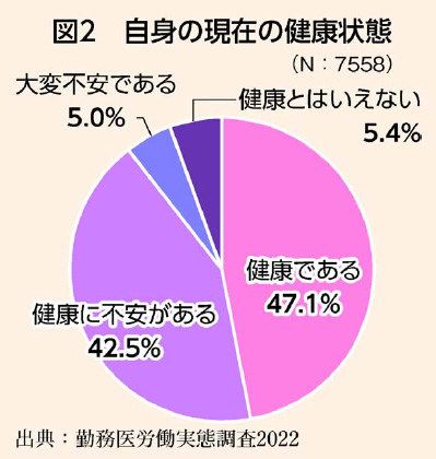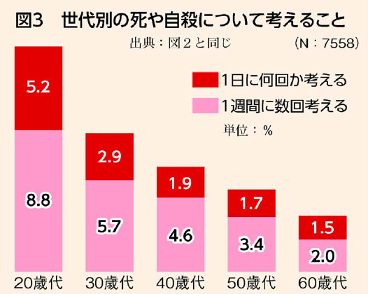 現在、人口比で見た日本の医学部卒業者の数はOECDで最下位(図1)。厚労省の調査では、病院勤務医の4割に当たる約8万人が、年間960時間以上の時間外労働を行い、うち約2万人が1900時間以上の時間外労働をしています。全国医師ユニオンの勤務医を対象にした調査では、月の休日が1日もないとの回答が5%、約5割が自身の健康に不安を感じています(図2)。「死や自殺について考える」との回答は7%で、とりわけ20代では14%という危機的状況です(図3)。