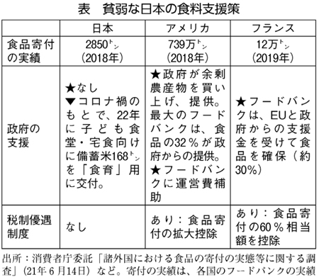 21年6月に公表された消費者庁の調査で、アメリカやフランスに比べて、極めて貧弱な日本の食料支援策が浮き彫りになりました(表)。フードバンクへの食品の寄付量はアメリカの739万トンに対し、日本は2850トンで、わずか0・4%にすぎません。