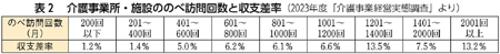 しかしこのアンケートは、国が抽出した事業所だけが対象の上、調査項目が膨大なため、人員の少ない小規模事業所ほど回答が難しく、「実態を正確に反映していないのでは」と言われています。その調査結果を見ても、のべ訪問回数が一番少ない事業所群(月200回以下)の収支差率は、わずか1・2%(表2)です。もっとも回数の多い事業所群(月2001回以上)は13・2%で、大きな開きがあります。