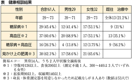 一目で肥満の人が多いことが目につきました。検査結果(表)をみても、高血圧や糖尿病の有病率は非常に高くなっています。血糖値は測定不能なほど高値の人もいましたが、投薬などの治療を受けている人はごく一部でした。また甲状腺の異常は有意に多く、全摘出の人も2人いるという状況で、被ばくの影響が疑われます。