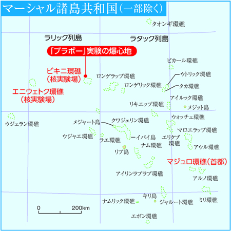 太平洋の赤道付近に位置し、29のサンゴ礁と5つの島で構成された島しょ国。1914~1944年まで日本の植民地支配があり、その後1986年に独立するまでアメリカの統治下にあった。1954年3月1日の水爆ブラボー実験(広島型原爆の1000倍の威力)をはじめ1946~1958年までに、アメリカによる計67回の核実験が行われ、強制移住や被ばくによるさまざまな被害を受けている。