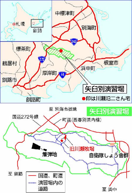 「旧川瀬牧場」は、別海町と厚岸(あっけし)町、浜中町にまたがる日本最大の陸上自衛隊矢臼別演習場のど真ん中にあります(地図)。「北の反戦地主」と呼ばれた、川瀬氾二さんが守り抜いた民有地です。