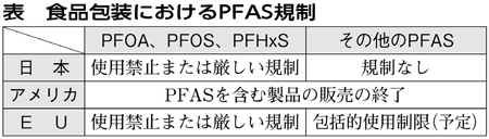 さらに、ファストフードのポテト、ハンバーガー、パイの包装紙からも、微量ですが検出、または検出の可能性があるものが出ています。海外では、食品からの摂取リスクを減らすために、日本以上に規制強化がすすんでいます(表)。