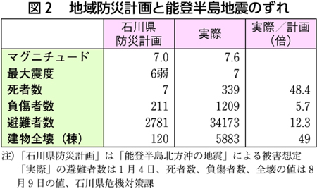 どの自治体でも地震などの被害を想定し、想定した被害にもとづいて地域防災計画をつくっています。石川県でも県が被害を想定して計画をつくり、それをもとに市町村が個別の計画を策定していますが、県の防災計画上の被害想定は図2の通りです。想定震度は6弱で、能登半島地震は震度7。死者数は想定7人ですが、実際は339人(うち関連死110人)で、48・4倍です。負傷者数、避難者数、建物の全壊と、いずれも実際の被害が想定をはるかに上回ります。