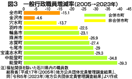 図3は自治体職員の増減率です(2005~2023年)。輪島市で23・1%、珠洲市で26・9%、能登町は39・3%も減っています。