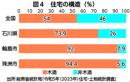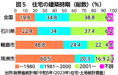 能登半島地震では、直接死の8割以上が、阪神・淡路大震災(1995年)と同様に建物の倒壊によるものです。住宅の構造は地方ほど木造が多い。輪島市、珠洲市では9割以上が木造です(図4)。建築時期も両市では建築基準法の改定前(1980年以前)と同法の再改定前(1981~2000年)の合計で全体の7~8割を占めます(図5)。2000年以前の木造住宅は耐震診断を受け、耐震性がなければ耐震改修をするというのが国の方針です。