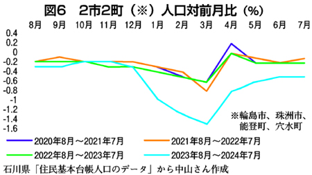 その通りだと思います。被災した市町は過疎地ですが、地震で人口減少が加速しました(図6)。住居を失った人が子どもを通学させるために転居した例も多く、輪島市では小学生が42・5%も減りました。市町は避難した人たちに戻ってもらおうと、今年末または今年度末までに復旧・復興プランを策定しようととりくんでいます。