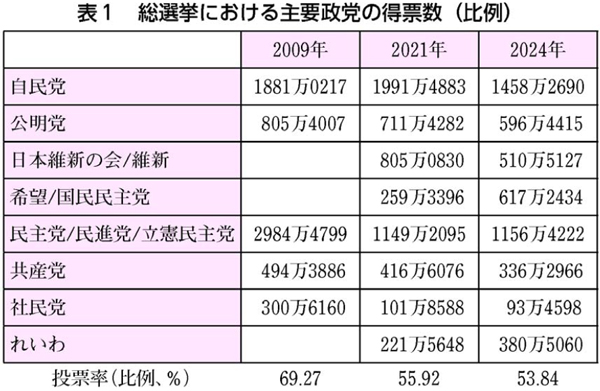 第1は、この選挙における自民党の大敗は歴史的なものだという点です。自民党の比例得票率26・73%は、21世紀に入ってからの16回の国政選挙で下から2番目。得票数でも、21年総選挙から533万票も減らし、1500万票を割ってしまいました(表1)。