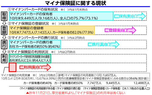 「これまで紙の保険証を受付に出すだけですんだのに。誰が便利なんだろう」と森山さん。「資格確認に時間もかかる。メリットはそこまで感じない」と同診療所の糸井祥太さん(事務)も応じます。薬剤情報も診療報酬明細書(※1)確定後に反映され、最大1カ月半ほどかかります。健診情報も健診事業者の請求後に反映される上、健康保険の健診(特定健診)などに限られます。