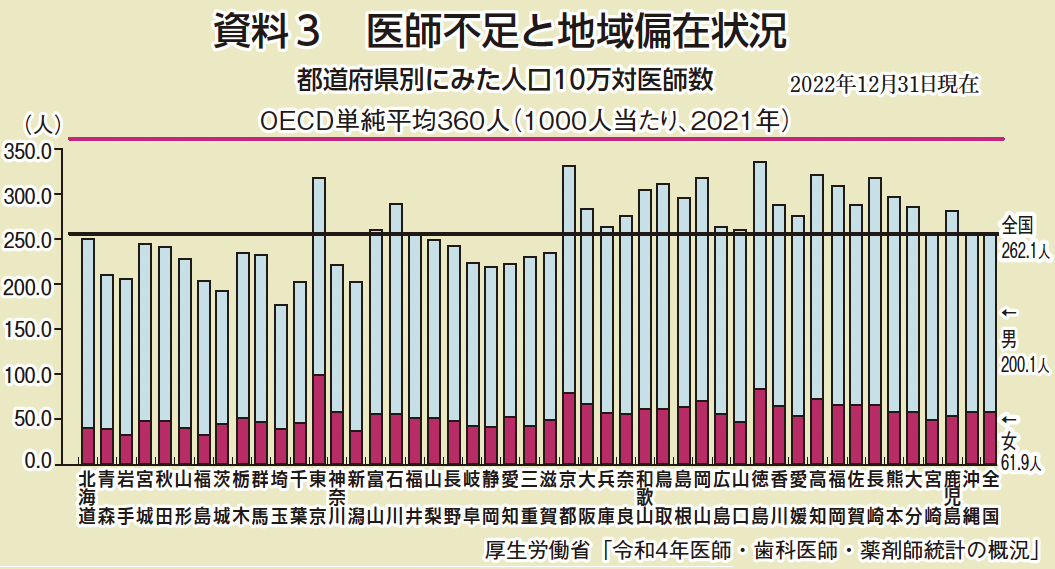 OECD加盟国の医師数の平均は人口1000人あたり、3・6人に対し、日本では2・5人で、OECD平均に達するためには約13万人の医師が不足しています。医師が偏在しているといっても、人口10万人あたりの医師数がもっとも多い336人の徳島県でさえ、OECD平均の360人を下回っています(資料3)。
