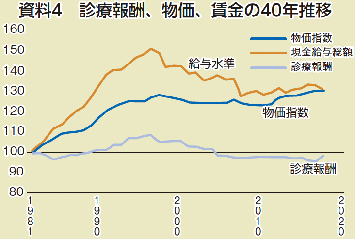 この40年で、給与水準、物価指数は30%以上、上がっているのに、診療報酬はほとんど上がっていません(資料4)。