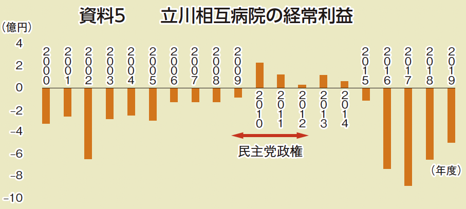 当院の経常利益で、2010~14年で黒字だった時期は、自民党に変わった民主党政権下で、診療報酬の改善がはかられた時期です(資料5)。病院の赤字は、政権によってつくりだされたものです。