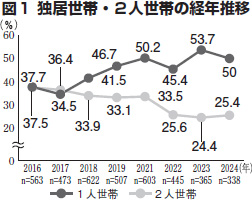 被災による入居者は減り、高齢化しています。入居者の半数が独居で、その割合は増加傾向(図1)。うち70代以上は68・7%、近くに親戚や家族がいない人も21・9%でした。