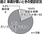 過去1年間に健診を受けた人は73・7%。治療の必要がある人は79・6%、体調が「とても悪い」「あまりよくない」は35%。「受診を我慢することが多い」は18・6%(図2)。理由は医療費(42・9%)に次ぎ、「付き添う人がいない」28・5%。介護保険サービスや地域コミュニティーと結びついていない可能性を示しました。