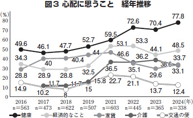 生活が「たいへん苦しい」「やや苦しい」は52・4%。理由は「食費」「水光熱費」が多く、今後の心配は「健康」が上昇(図3)。困窮群は普通群に比べ、「受診を我慢する」「抑うつ症状を有する」割合が優位に高い結果でした。