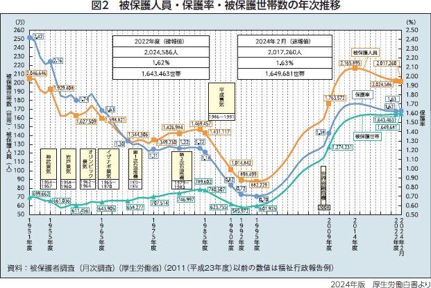 生活保護利用者の人口に占める割合は、2011年で約1・6%。最近でも1・63%(2024年2月)です(図2)。1951年は2・42%でした。今の利用者が多いわけではありません。