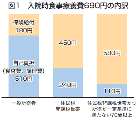入院時食事療養費は、1食あたりの総額と自己負担を国が定め、その差額を保険給付として支給しています。支給方法は、各保険者が被保険者に代わり、保険医療機関に直接支払う、現物給付方式です。2006年は1食あたりの費用として640円(1日3食で1920円)でした。その後、2024年に1食あたり670円、2025年に690円と上がっています(図1)。しかし、これは患者の自己負担を増やしているだけで、給付は変わらないうえに、物価高騰に対応できていません。