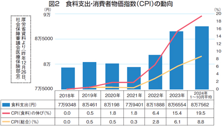 食料支出・消費者物価指数(CPI)の動向に目を向けると、2018年を起点に、総合は8・8%の伸び、食料は19・5%の伸びで、上昇率は2倍近い差となっていました(図2)。米価高騰は連日のように報道されています。