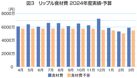 同社管理課の管理者、杉田大樹(ひろき)さん(事務)は、取材に対し「2023年度実績にもとづく2024年度の食材費予算と実績は、すべての月で実績が予算を上回った(図3)。平均すれば食材費の予算超過は1割強。食材費が2割近く値上がりしているなかで、1割強にとどめたのは現場の努力。収益はぎりぎり出ているが、それは人手不足が理由で、現場は疲弊している。経営努力と言っても、納入業者に無理をお願いしており、胸が痛む。入院時食事療養費の給付がもっと手厚くなれば、病院、給食会社だけでなく、納入業者、生産者も助かるはず」とコメント。