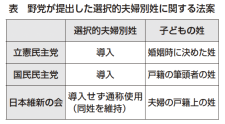 社会情勢の変化と世論の高まりを受け、すでに約30年前の1996年に、法務省が選択的夫婦別姓を含む民法改正案要綱を公表しました。しかしいまだに改正に至っていません。その後も現在までに、国連女性差別撤廃委員会から四度、是正勧告を受けているにもかかわらず、国会は腰が重いままです。世界で夫婦同姓が義務付けられている国は、残すところ、日本だけになりました。今年の通常国会(1月24日~6月22日)では、28年ぶりに、選択的夫婦別姓制度の導入を含む民法改正案が審議入りしましたが、自民党は導入に反対、法案も野党3党がばらばらに出し(表)、政局の駆け引きの材料にされているように感じました。非常に残念です。