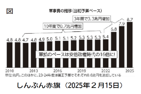 2025年、戦後80年の年に自公政権は大軍拡へのかじを切りました。日本の25年度予算の軍事費は前年比9・4%増の8兆7000億円であり、軍事費を野放図に増加させ、侵略戦争に突きすすんだ戦前をほうふつさせる大軍拡予算です(図参照)。また、軍事ローン(支払債務の後払い契約)の残高は15兆7000億円、25年度予算の1・8倍であり、岸田政権の安保3文書改定以降の3年間で約3倍に激増しており、今後も雪だるま式に軍事費が増大していきます。さらに、軍事国債の発行残高は2兆9000億円。歴代政権は、戦時中に国債発行を乱発した反省から、「国債を軍事目的に使用しない」としてきましたが、軍事施設への建設国債を強行しています。そして、補正予算による軍事費捻出も常態化し、財政法で災害対策や経済対策など、特に緊要な支出に限定されていることからも逸脱しています。とどめは、防衛力強化資金3兆4000億円の原資には、国立病院機構やJCHOなどの、積立金を不必要だと強制徴収したものや、外国為替資金特別会計の繰越金を流用したものが含まれており、社会保障費や国民生活から搾取したものです。