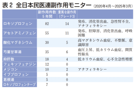 表2は、民医連加盟の医療機関・薬局から寄せられた、OTC類似薬の副作用モニターの報告数。ロキソプロフェン14件、アセトアミノフェン(カロナールなどに含有)11件の重篤な副作用が報告されています(2020年4月からの5年間)。ロキソプロフェンでは急性腎不全やアナフィラキシーショック、アセトアミノフェンでは肝障害や呼吸困難も。