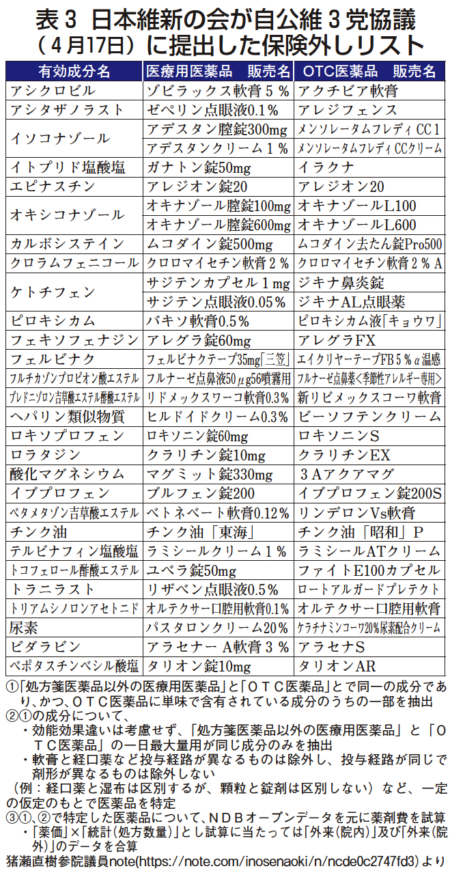 日本維新の会が今年6月にまとめた「社会保険料を下げる改革提言」では、平均で年間6万2500円の社会保険料引き下げを掲げています。この6万2500円は、協会けんぽ、組合健保、共済組合の被保険者数で4兆円を割ったもの。1カ月に直せば約5200円。現役世代の労働者の場合は労使折半のため、軽減額は月約2600円です。しかしOTC類似薬が保険からはずされて市販薬を購入することになれば、たいへん高額な医薬品を購入することとなり、軽減額は、ちょっとした病気・けがで吹き飛んでしまいます。