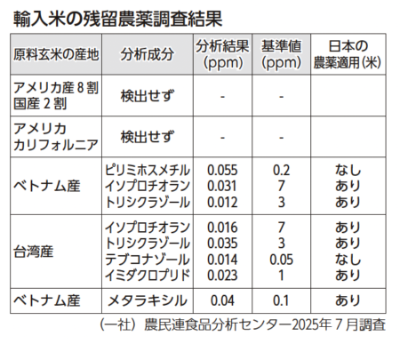 残留農薬調査では、ベトナム、台湾産から農薬が検出されました(表)。日本の残留基準と比較すると、基準値以内に収まっていましたが、問題なのは、ピリミホスメチル(殺虫剤)、テブコナゾール(殺虫剤)の2つがベトナム産、台湾産から検出されていることです。日本ではピリミホスメチルは農薬としての登録が失効し、製造・販売ができない成分です。さらに、日本では認められていないポストハーベスト(収穫後)農薬でもあります。アメリカなど一部の国では長距離・長時間の輸送・貯蔵の際に、防カビ、防腐、殺虫防除など食品の品質維持のために、農作物への農薬の収穫後散布が認められています。テブコナゾールは米への使用が認められていません。検出された輸入米は、国産米とは異なる基準で栽培、流通された米であるのは明らかです。しかし、自民党政権は、日米貿易合意によって、アメリカ産米を現在よりさらに75%増やそうとしています。これまでアメリカ産米はMA(ミニマムアクセス)枠77万トンのうち、毎年約35万トンが輸入されており、75%増になれば25万トン増に相当し、アメリカ米の輸入量は60万トンにもおよぶことになります。「MA米を備蓄に使え」という今年5月の財政制度等審議会(財政審)の提言で浮上してきたのが、棚上げ備蓄(※)を改め、1~2年で販売する回転備蓄方式に回帰し、MA米を低価格米として販売するという策略です。