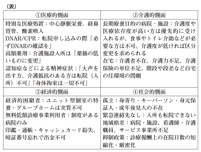 退院支援を阻む壁として4つの側面(表)に分類をしました。(1)医療的側面です。転院の際にDNARの確認を求められることや、低額な薬価に変更を求められることなどです。(2)介護的側面です。長期療養が必要な方の場合、介護度や医療依存度が高く経管栄養や寝たきりの方などは優先的に受け入れを検討しても、食事やトイレ介助を必要とする方は受けないという病院・施設があります。在宅に退院する際も、介護者・介護力の不足、介護保険の単位数不足など、介護サービスが利用できないことで、在宅退院がかなわないことがあります。(3)経済的側面では、無年金や低年金の方にとっては、施設費用や介護サービス費が高額であることを理由に入所やサービス利用をあきらめざるを得ない場合もあり、無料低額診療事業の利用者は他の医療機関への受診・転院が難しくなります。(4)社会的側面では、身寄りがない、保証人がいない人は入所も転院も断られてしまうことや、診療報酬上の在院日数が厳しくなり、十分な退院準備ができないこともあります。