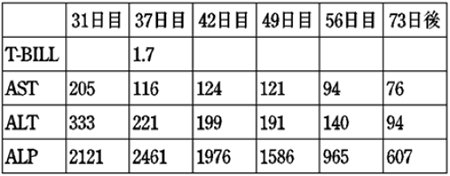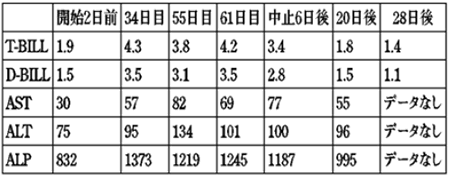 〔症例1〕70代後半の女性。絶食のためフルカ リック2号を投与中。カロリーアップを目的に20%イントラファット100mlの投与を開始。36日目に肝機能障害が分かり、一旦、イントラファットを中 止。その6日後に再開、62日目に再び中止。2回目の中止後28日目にほぼ正常値まで肝機能は回復した。